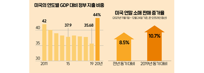 실제 미국 정부는 코로나 19로 인한 경제침체를 최소화하기 위해 ‘미국 구조계획법’에 따라 2020년 3월 이후 행정부 차원에서 대규모 경기 부양을 위한 재정 확대 정책을, 그리고 연방준비제도이사회(Fed)를 통해 제로금리와 무제한 양적 완화 기조의 통화정책을 추진하였다. 2020년 미국의 국내총생산(GDP) 대비 정부 지출 비중이 역대 최고치인 44%에 달할 정도로, 정부의 적극적인 지원정책은 이후 가계 소비의 급증으로 이어졌다.