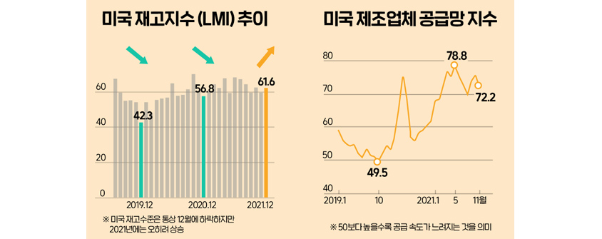 마스터카드(Mastercard)가 발표하는 소비자지출 패턴 분석 데이터 ‘스펜딩펄스(SpendingPulse)’ 보고서에 따르면 지난해 미국의 연말 특수 기간(2021.11.01~12.24) 동안 온·오프라인 소매 판매가 전년 동기 대비 8.5%, 팬데믹 직전인 2019년 동기 대비 10.7% 증가한 것으로 나타났다. 이는 17년 만에 가장 높은 수치라고 한다. 이러한 소매 수요의 급증은 유통기업의 안전재고(Safety Stock) 확보와 제조기업의 생산 확대를 위한 원자재 구매 노력으로 이어진다.