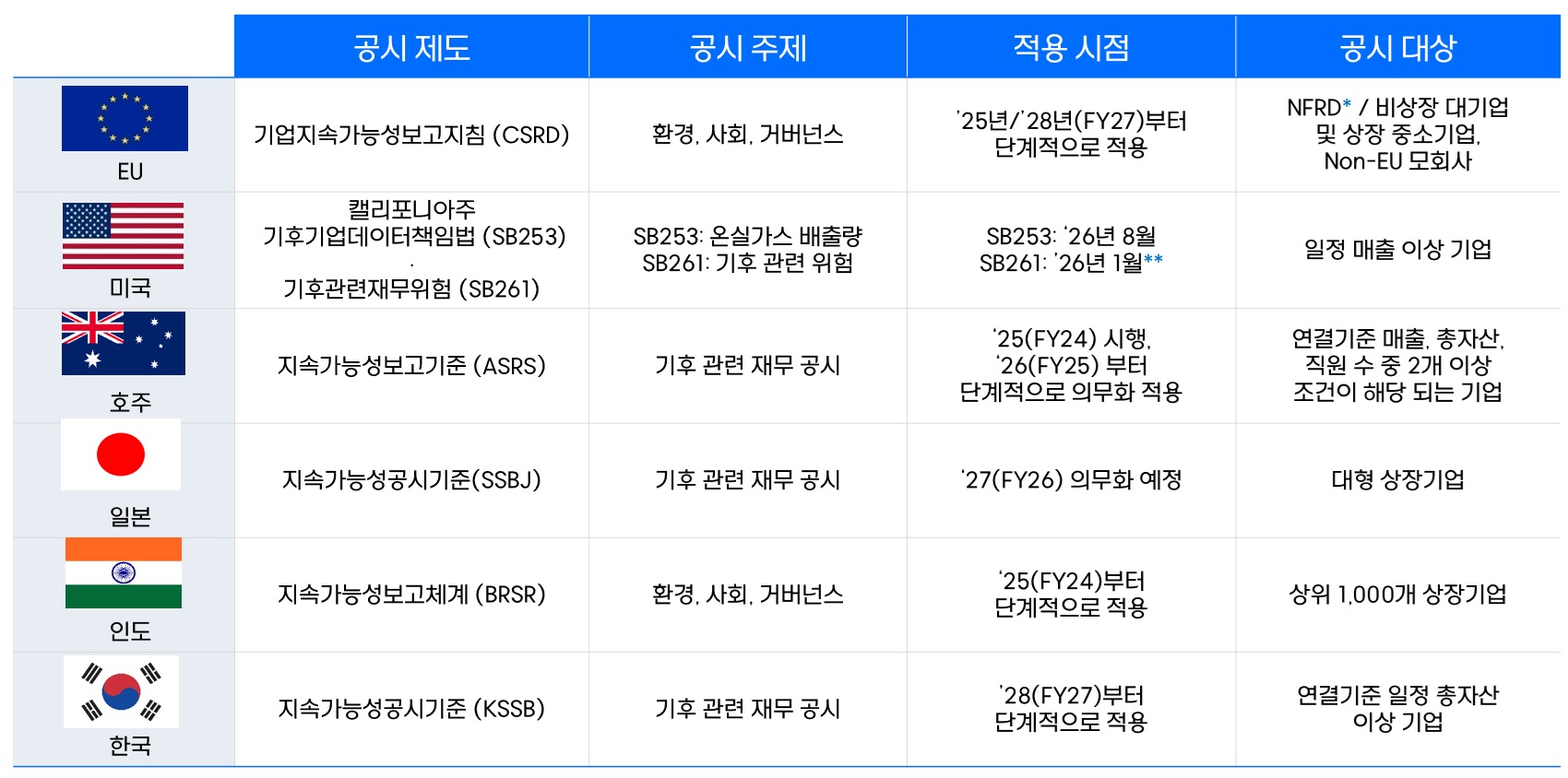유럽연합(EU)은 이미 2024년 회계연도(2025년 공시)부터 ESG 공시 의무를 단계적으로 EU 내 기업에 적용했고, 2026년에는 EU에서 일정 규모 이상의 사업을 하는 글로벌 기업까지 의무화를 적용하는 등 규제 대상을 순차적으로 확대하고 있습니다. 이로써 EU에서 사업을 영위하는 기업은 지속가능성 전반에 대해 이해관계자에 공개해야 하는 상황입니다.