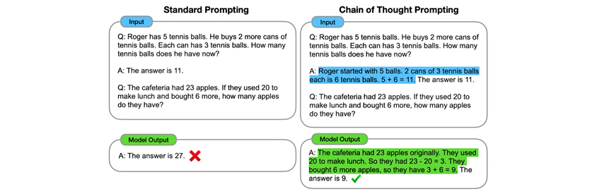 생성형 AI 모델의 동작 원리를 설명하기 위한 접근법 중의 하나로, 딥마인드의 연구자들은 언어 모델에게 질문하는 행위인 Prompting에 ‘Chain of Thought’라는 기법을 적용함으로써 모델의 동작 방식에 대한 투명성을 높일 수 있다고 주장했습니다. 앞서 설명한 Surrogate Model과 같은 XAI는 기존의 AI 모델의 의사결정을 설명하기 위해 또 다른 AI 모델을 생성하는 추가 투자가 필요한 방법입니다. 그런데 Chain of Thought는 Prompting을 어떻게 하느냐에 따라 LLM이 자신의 의사결정에 대해서 스스로 설명하게 만듭니다. 이러한 결과는 추론 방식을(Thought) 유추할 수 있도록 여러 단계로 Prompting를 분해해서(Chain) 수행함으로써 LLM도 이에 따라 어떻게 문제를 해결하는지 절차적으로(Chain) 답하게(Thought) 함으로써 가능합니다.