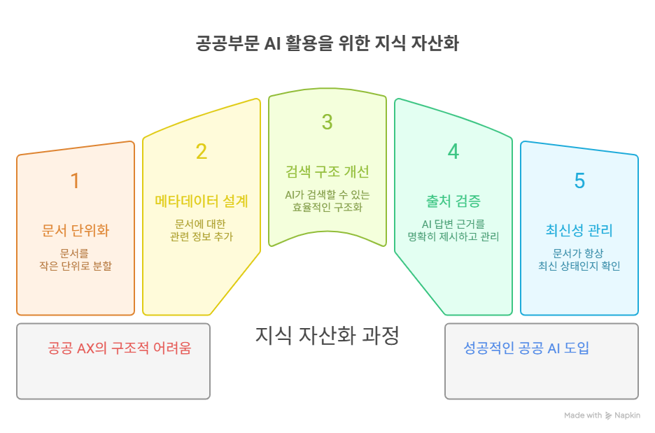 공공부문 AI 활용을 위한 지식 자산화 이미지로 지식 자산화 과정을 보여주고 있으며 1. 문서 단위화 - 문서를 작은 단위로 분할, 2. 메타데이터 설계 - 문서에 대한 관련 정보 추가, 3. 검색 구조 개선 - AI가 검색할 수 있는 효율적인 구조화, 4. 출처 검증 - AI 답변 근거를 명확히 제시하고 관리, 5. 최신성 관리 - 문서가 항상 최신 상태인지 확인 이 단계별로 나와있고 1단계 하단에 공공 AX의 구조적 어려움, 5단계 하단에 성공적인 공공 AI 도입 이라고 적혀 있다.