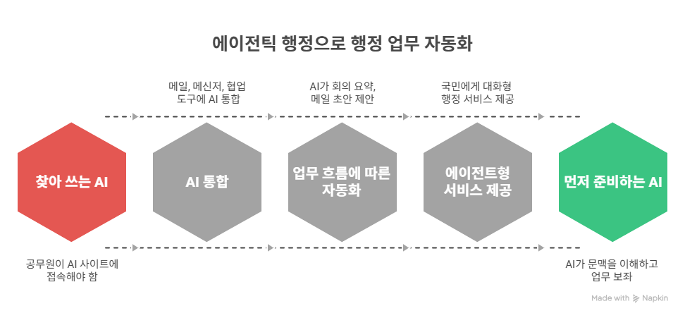 에이전틱 행정으로 행정 업무 자동화를 단계별로 나타낸 이미지로 찾아 쓰는 AI (공무원이 AI 사이트에 접속해야 함), AI 통합 (메일,메신저,협업 도구에 AI 통합), 업무 흐름에 따른 자동화 (AI가 회의 요약, 메일 초안 제안), 에이전트형 서비스 제공 (국민에게 대화형 행정 서비스 제공), 먼저 준비하는 AI (AI가 문맥을 이해하고 업무 보좌) 단계로 그려져 있다.