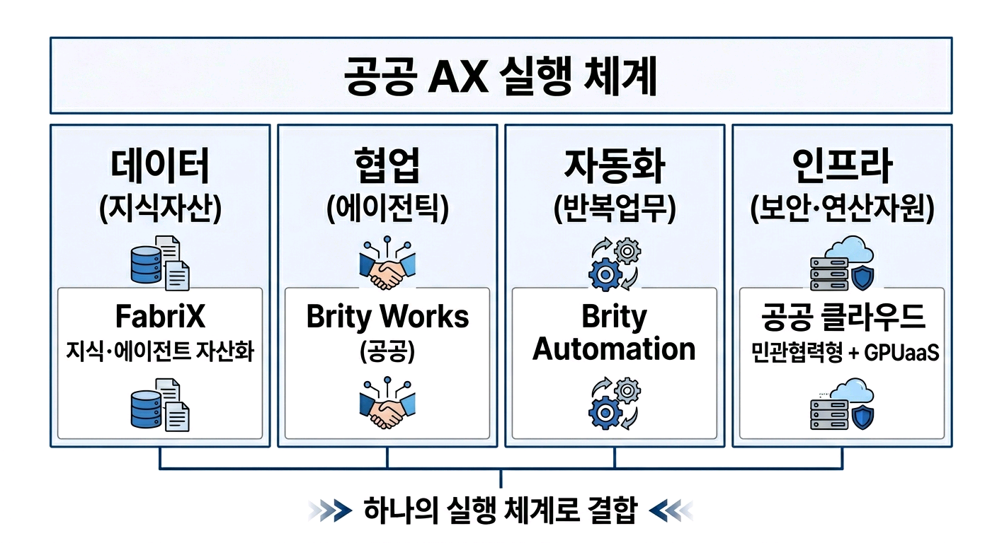 공공 AX 실행 체계를 보여주는 이미지로 데이터(지식자산)-FabriX 지식·에이전트 자산화, 협업(에이전틱)-Brity Works(공공), 자동화(반복업무)-Brity Automation, 인프라(보안·연산자원)-공공 클라우드 민관협력형 + GPUaaS 를 하나의 실행 체계로 결합 하는 것을 보여주고 있다.