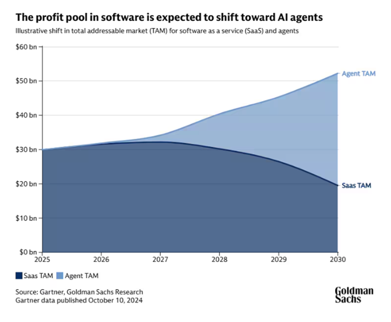 [그림 1] SaaS와 에이전트의 수익시장 변화 (출처: 골드만 삭스)