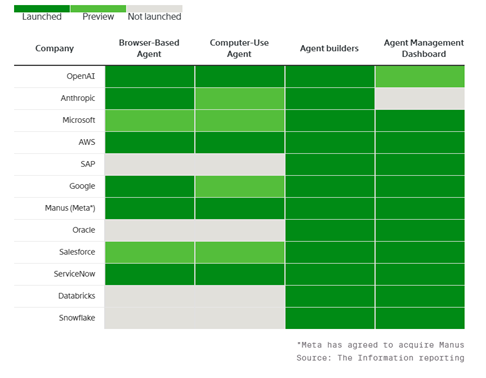 [그림 3] SaaS 대표기업과 AI 기업의 에이전트 제품 출시 현황 (출처: The Information)