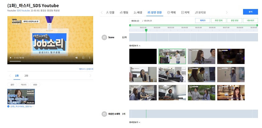 이커머스와 소셜 미디어의 중요성이 높아지면서 기업의 마케팅 활동도 활발해지고 있는데요. 지금까지는 아무리 짧은 영상이라도 사람이 직접 보면서 편집을 수행해야 했습니다. 삼성SDS Brightics Visual Search는 이 점에 착안해 한 편의 동영상을 실시간으로 짧게 편집해 주는 서비스를 준비했습니다. 홈쇼핑에서 1시간짜리 방송이 끝나면 실시간으로 소셜 미디어에서 사용할 수 있도록 자동 편집해 2~3분짜리 영상을 만드는 것입니다.