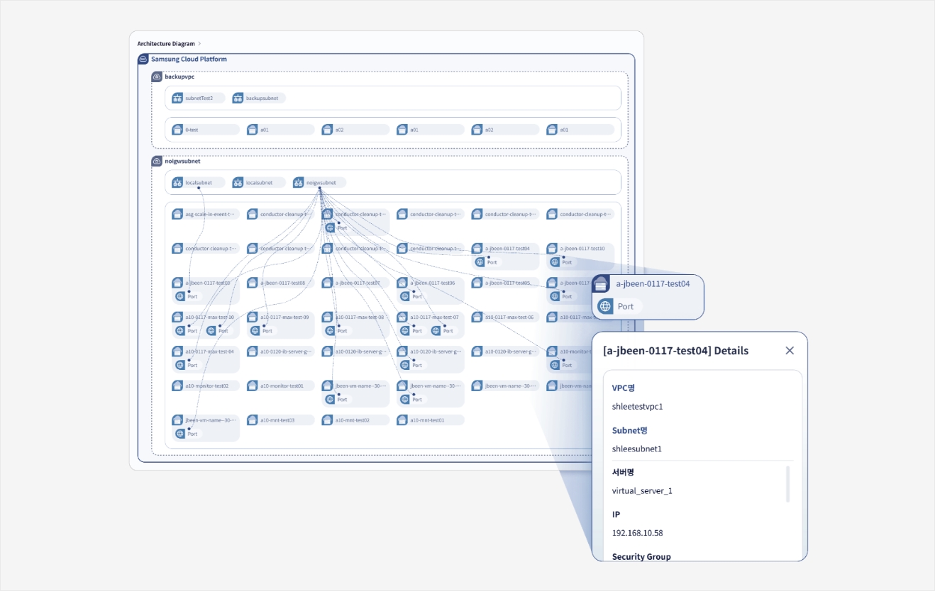 Architecture Diagram에서 자원 간 연관 관계와 함께 자원에 대한 주요 정보를 팝업 형태로 제공하여, 각 자원 별 상세 화면으로 이동 없이 빠르게 자원 정보를 확인할 수 있습니다.