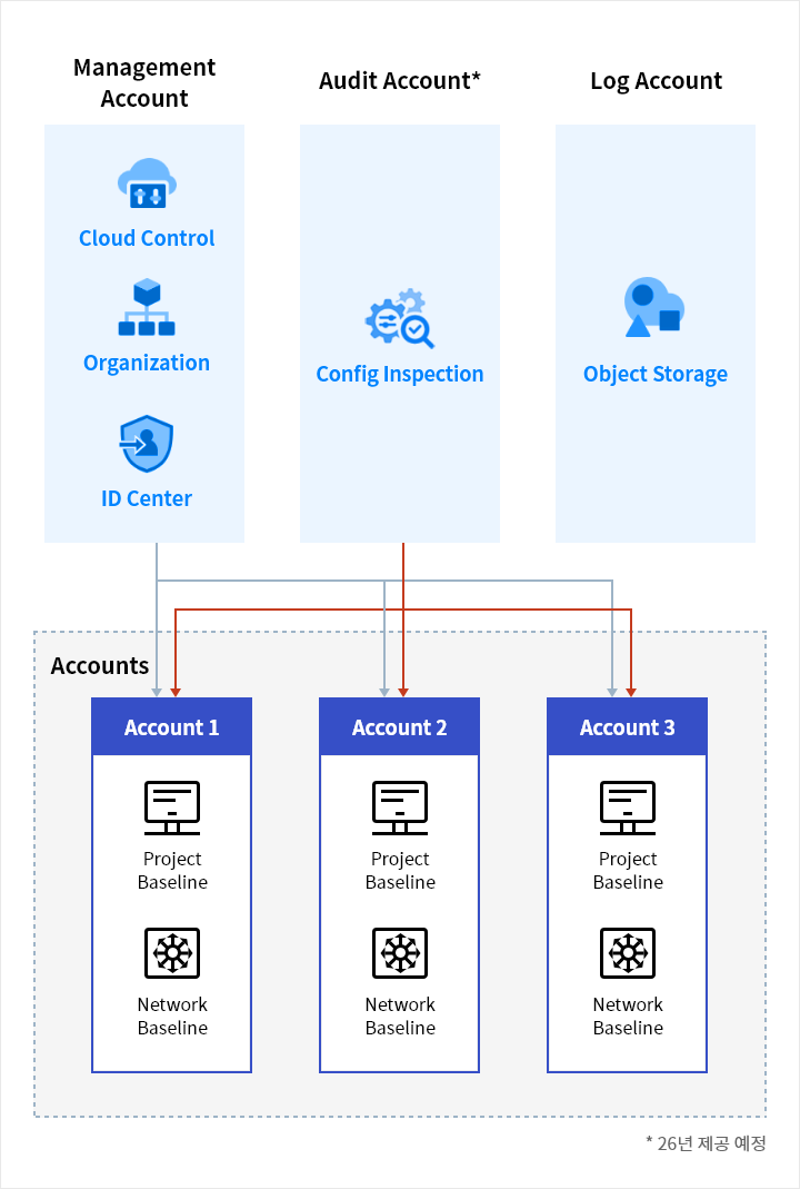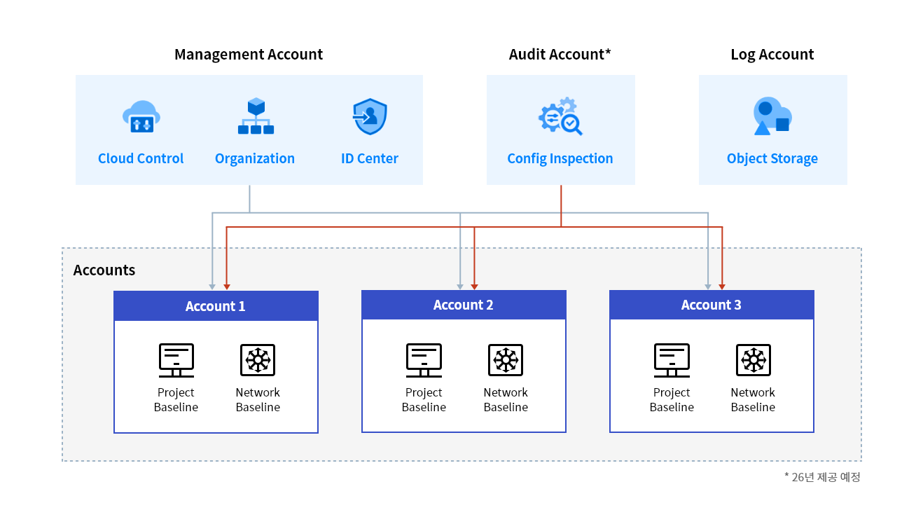 Samsung Cloud Platform 계정, 조직 단위(OU), 가드레일, 로깅 등 필수 인프라를 자동으로 설정합니다. 표준화된 환경에서 신규 계정 생성 및 기존 계정 초대가 가능합니다.