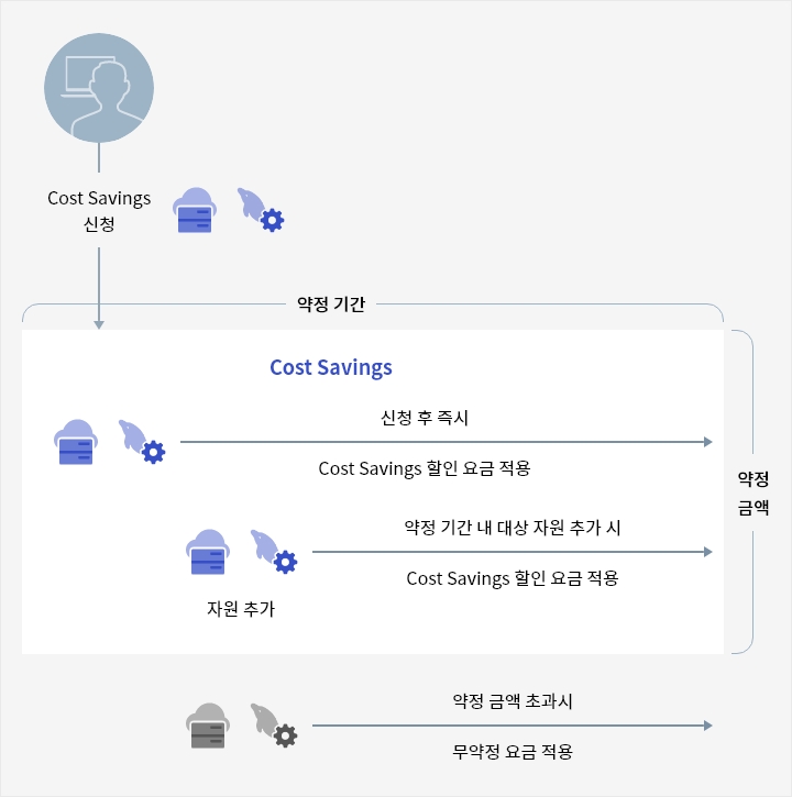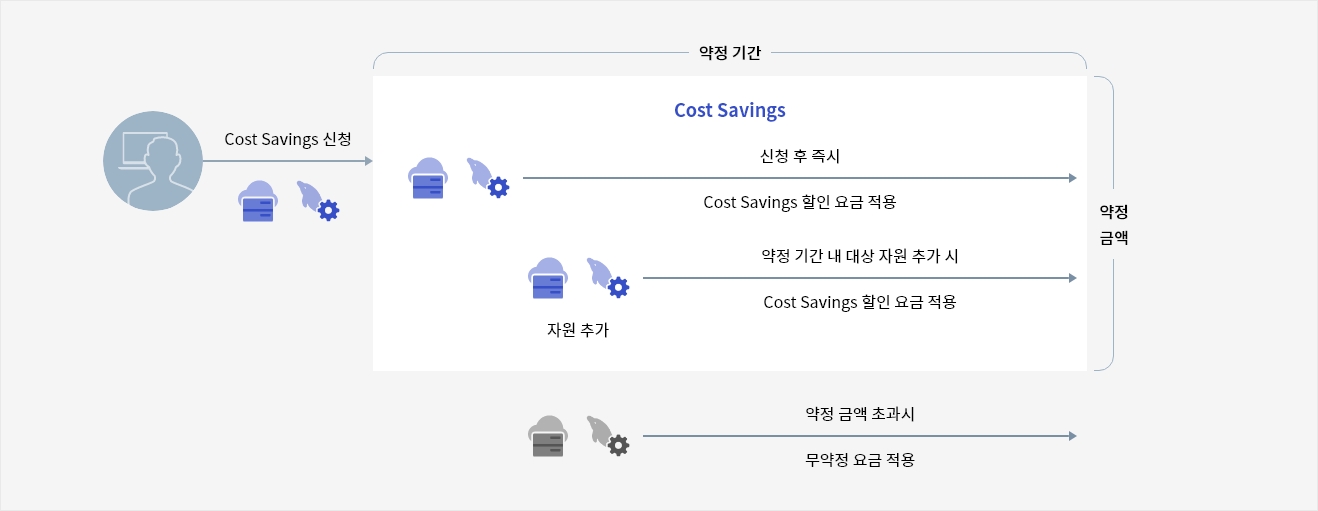cost savings 신청 → 약정기간:자원추가(약정기간 내 대상 자원 추가시 - cost savign 할인 요금 적용) → 약정금액