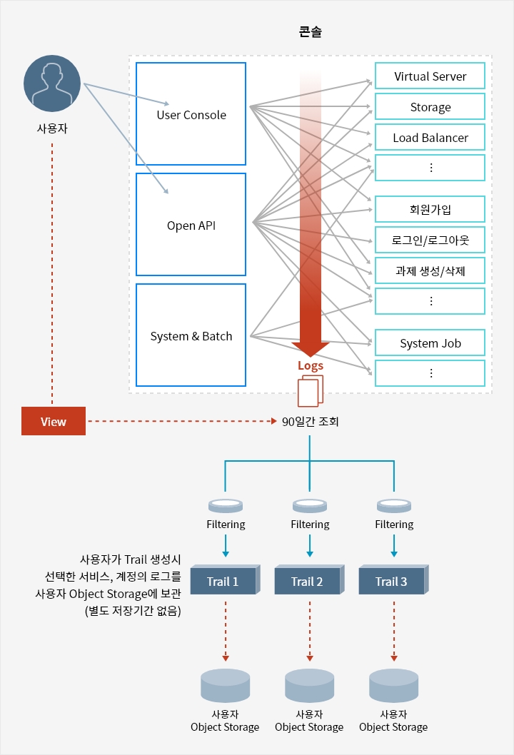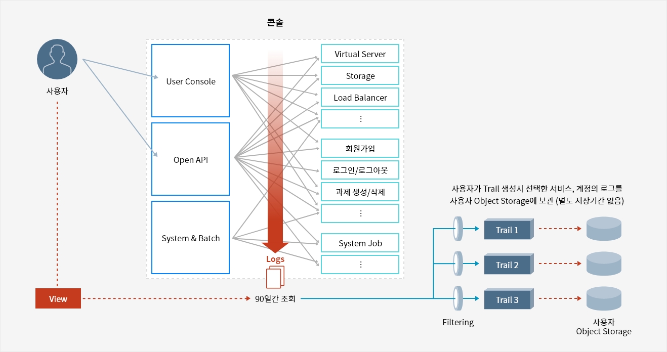 클라우드 서비스를 사용하면서 생성되는 수많은 로그는 Trail을 생성하여 사용자의 오브젝트 스토리지에 보관할 수 있습니다. 각 서버나 서비스 별로 따로 확인하지 않아도 되어 간편한 로그 관리가 가능합니다.