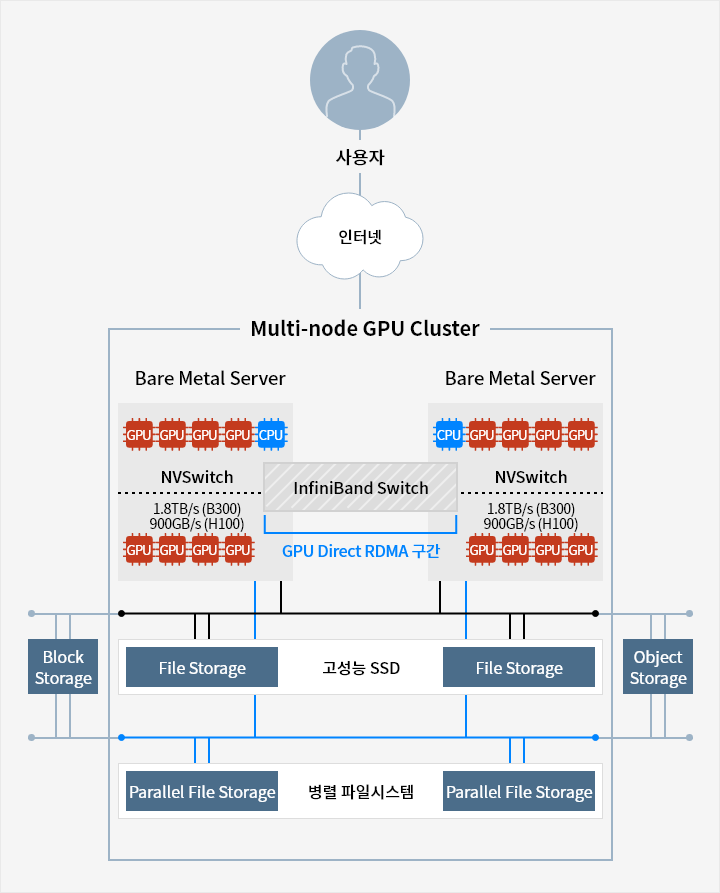 멀티 노드 GPU 클러스터는 삼성 클라우드 플랫폼(Samsung Cloud Platform, SCP)의 다양한 스토리지 자원과 연계하여 사용할 수 있습니다. 고속 네트워크와 직접 연동한 고성능 SSD 파일 스토리지와 NVMe 병렬 파일시스템 스토리지를 사용 가능하며, 블록 스토리지 및 오브젝트 스토리지도 연계하여 사용 가능합니다.