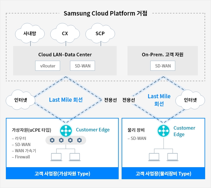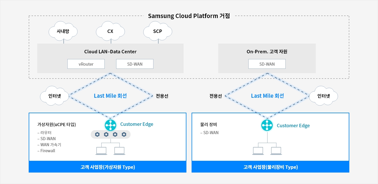 고객 사업장과 외부 네트워크 연결을 위한 Last Mile 회선과 엣지 자원은 고객이 주로 사용하는 애플리케이션 유형에 맞는 최적의 장비를 조합하여 패키지 형태로 제공합니다.
