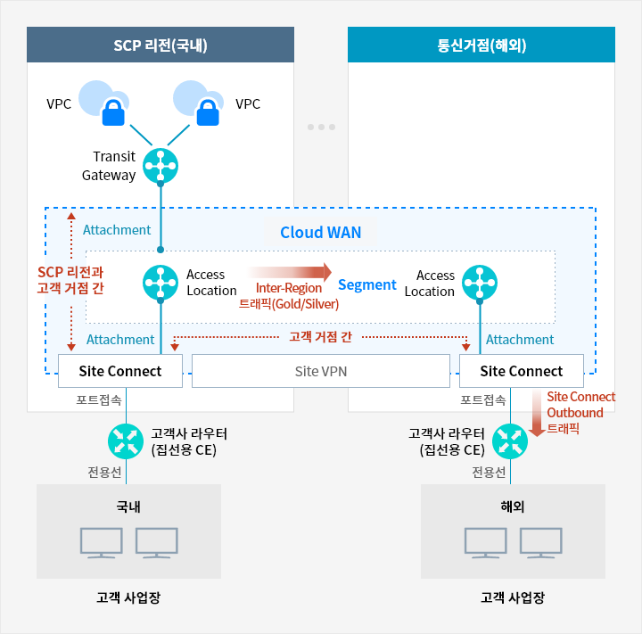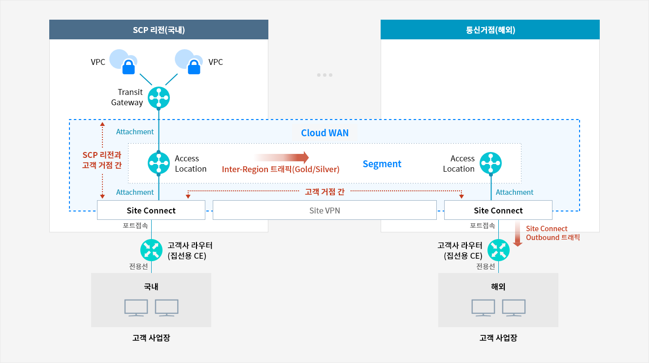 Cloud WAN에 연결할 수 있는 다양한 Edge 타입을 제공하여 SCP Transit Gateway 또는 고객 사업장의 로컬 회선을 편리하게 연결해 줍니다.