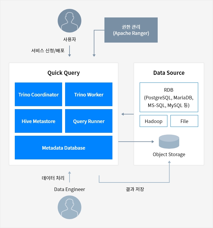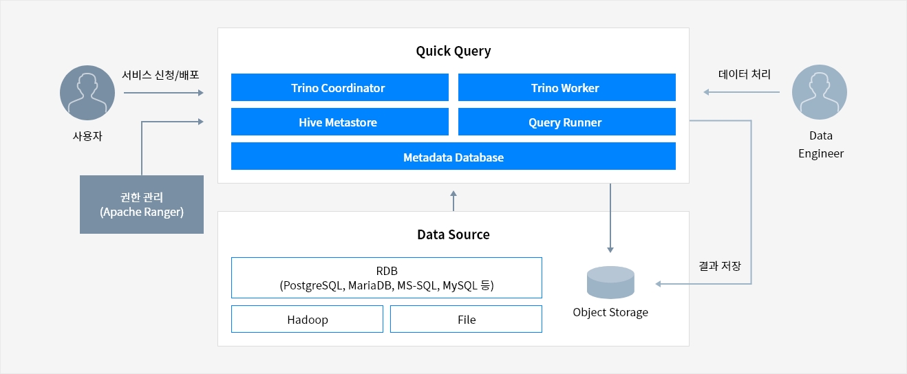 퀵 쿼리는 병렬 분산 처리가 가능한 Trino 엔진을 사용하여 자동으로 쿼리를 분할하고, 동시에 여러 노드에서 병렬 처리하여 대용량 데이터도 빠르게 쿼리 결과를 확인할 수 있습니다.