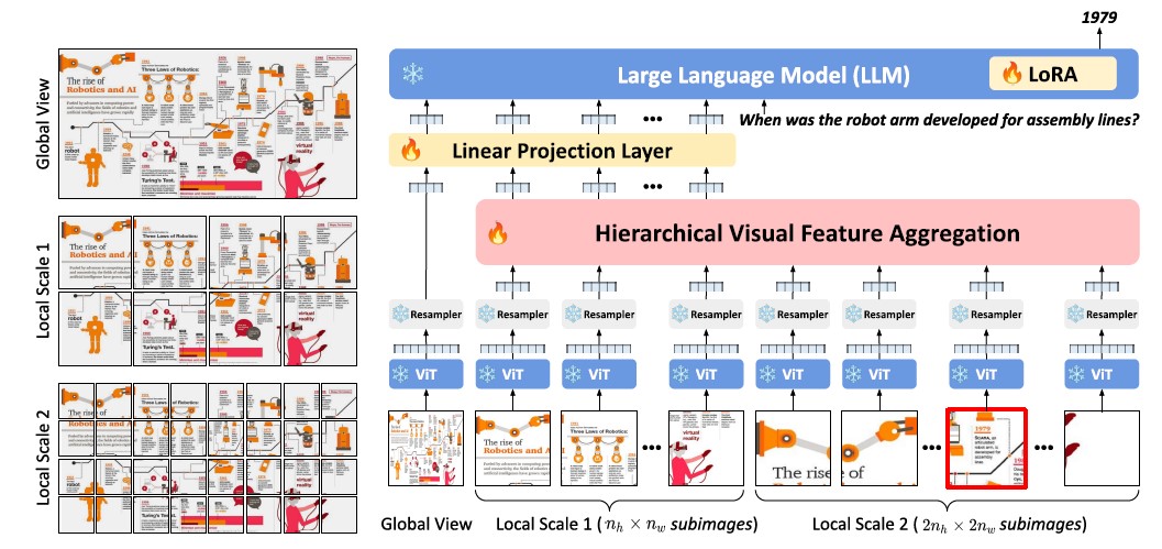또한, 다양한 이미지 스케일을 효과적으로 다루기 위해 다중 스케일 시각 입력 통합 프레임워크를 개발하고, 높은 해상도의 이미지에서도 상세한 정보를 캡처 할 수 있도록 보완하였습니다. 이를 통해 문서 이미지의 다양한 해상도와 비율을 더욱 효과적으로 처리할 수 있게 되었습니다.