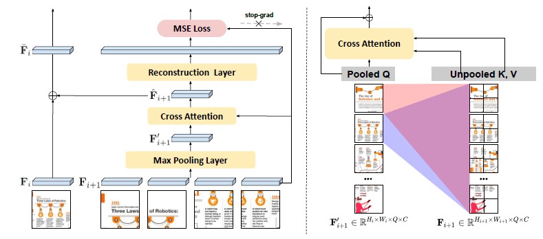 (오른쪽) 교차 어텐션 기반 풀링에서 각 그리드는 세분화된 시각적 특징 모두에 관여하며, 보다 상세한 정보를 보존하기 위해 세분화된 특징을 반영하여 요약합니다.