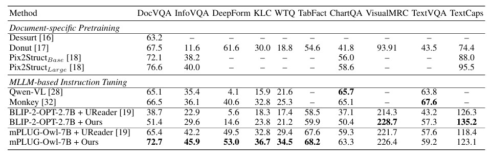 * 사전학습된 MLLM을 기반으로 문서 분석 Instruction Tuning을 제안. 상대적으로 낮은 Training 비용과 더 다양한 문서 이미지를 처리할 수 있음(관련논문; UReader: universal ocr-free visually-situated language understanding with multimodal large language model.)