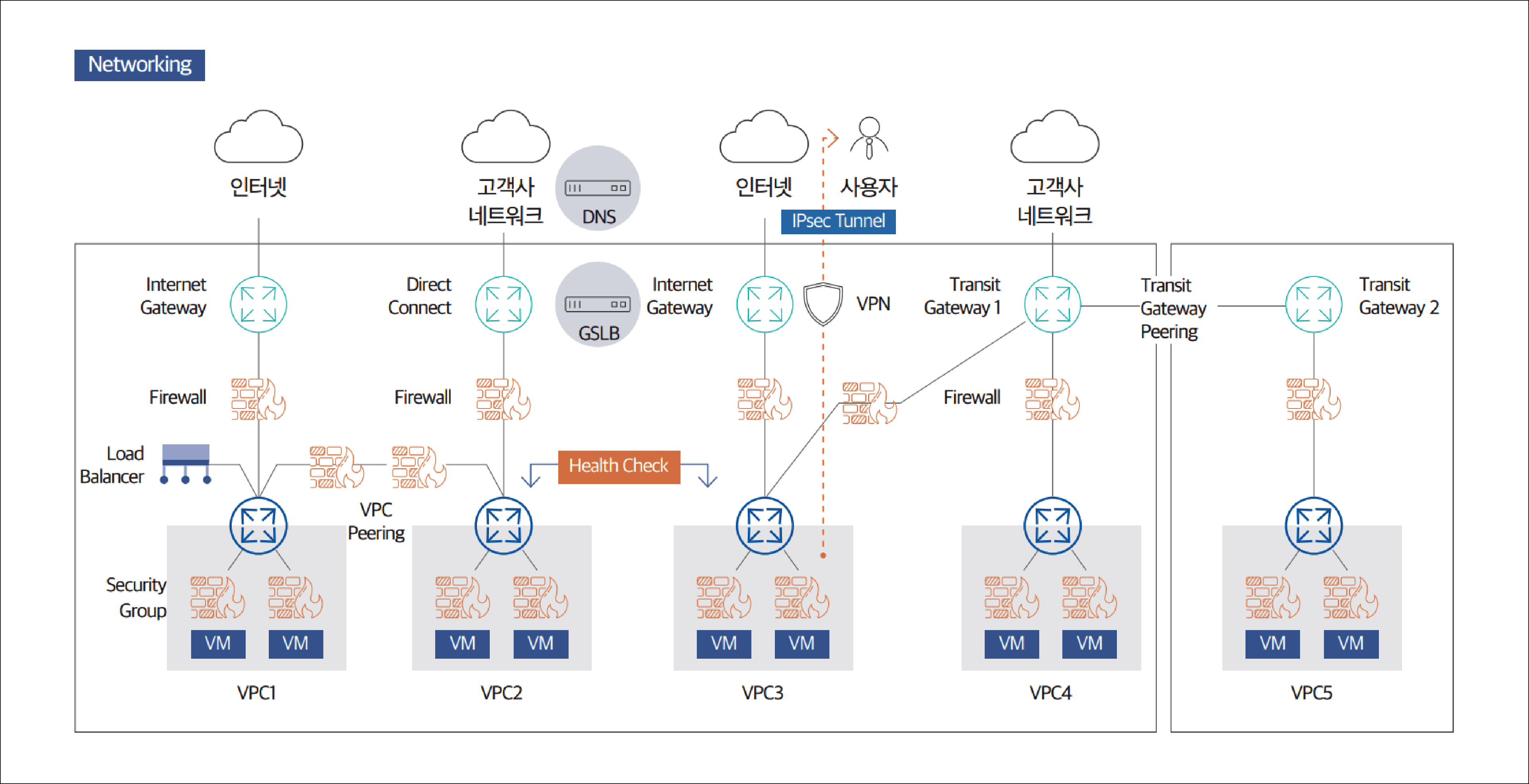 - 인터넷 - Inernet Gateway - Firewall - Load Balancer - Security Group - VPC1[VM-VM]