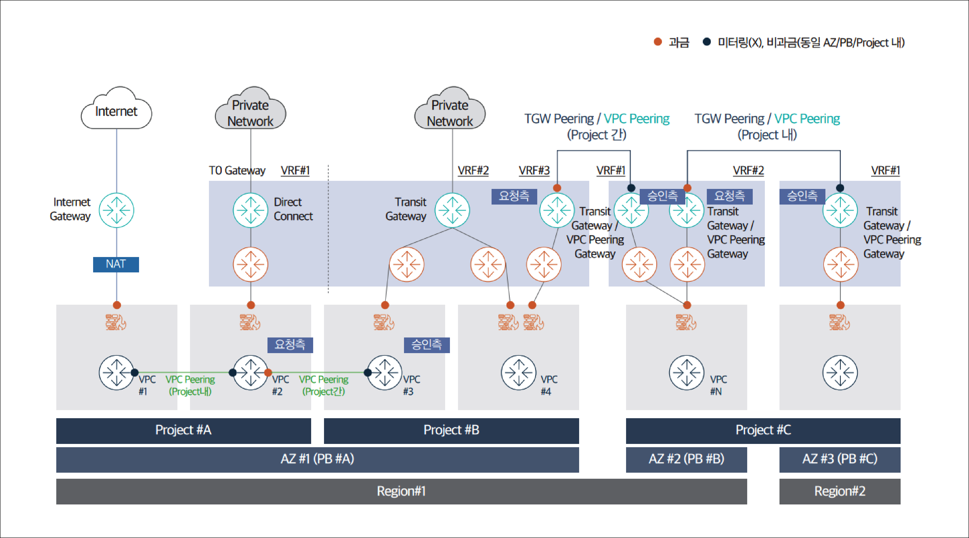- Private Network VRF#3/요청측[- TGW Peering/VPC Peering (Project 간) - VRF#1/승인측 - Rransit Gateway/VPC Peering Gateway] - Transit Gateway/VPC Peering Gateway - Fierwall(과금) - VPC#4