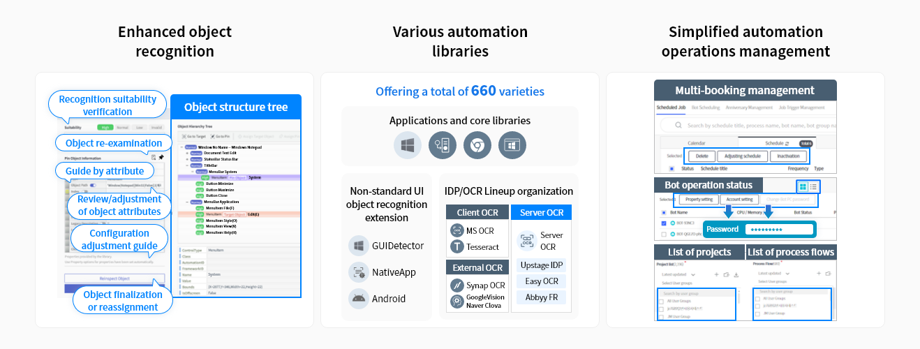 Brity Automation’s Orchestrator provides various features for deploying and managing automation scenarios, including real-time monitoring and remote bot PC control, offering security functions for stable operations.