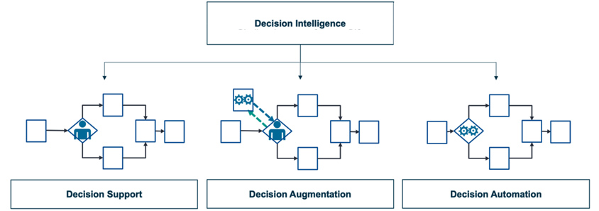 Os modelos de decisão impulsionados pela inteligência de decisão podem ser divididos em suporte à decisão, aumento de decisão e automação de decisão.