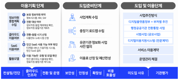 In this market environment, administrative and public institutions must prepare and assess their resource portfolios, including hardware, software, and applications, to migration to cloud native systems. The cloud migration follows the phases of "Planning for Use - Preparation for Adoption - Adoption/Use," and institutions should refer to the government's cloud migration guidelines throughout the process. In the "Planning for Use" phase, institutions should collaborate with cloud partners like Samsung SDS to discuss which systems to transition and by when, including infrastructure considerations. A key factor in this phase is the obsolescence of resources. Institutions should focus on rapidly transitioning outdated resources and prioritizing tasks that require improvement, all while developing an integrated migration plan that includes operational considerations. In the "Preparation for Adoption" phase, security, stability, scalability, preliminary coordination with related agencies on information projects, cost estimation, and securing the necessary budget should be considered. In particular, when deciding on the implementation approach in the "Adoption/Use" phase, it is crucial to consider the government's direction towards digital innovation, especially under the Digital Platform Government initiative. Reviewing which government budgets are available for use to support various digital innovation projects could be beneficial during this phase.