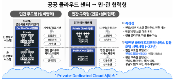 The second model is the "Public Cloud Center (Public-Private Partnerships)." This model involves collaboration between private data centers and administrative or public institutions to build a "Private Cloud" tailored to the institution's specific needs. It uses private/dedicated cloud services provided by private cloud providers, and it allows relevant agencies and startups involved in local administration to use the cloud environment, making it a model for advancing digital innovation in many local governments. A prominent example is the pilot project conducted by Jeonbuk Provincial Government in 2022, which collaborated with Samsung SDS. This model involved using the 'Samsung Cloud Platform' to create a physically dedicated cloud and transitioning sensitive internal systems to the cloud.