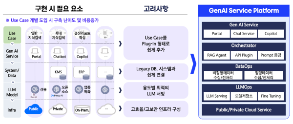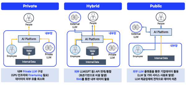 Hyperscale AI services can be configured using an AI platform in various architectures. Private Configuration: In this setup, a private LLM and AI platform are placed within the internal network, allowing all data to be processed internally. This requires GPU infrastructure for fine-tuning and serving the private LLM, which minimizes the risk of external data leakage. Public Configuration: This setup uses external public LLMs, such as OpenAI's GPT or HyperCLOVA X, along with an AI platform to leverage the organization's data. This approach involves costs for using the LLM and other services, and it requires defining how internal data will be transferred to external AI platforms. However, most public institutions require a hybrid setup. In other words, the AI platform is commonly located within the internal network, allowing for the choice between a private LLM and an externally linked public LLM through APIs. This configuration can use internal data via Retrieval-Augmented Generation (RAG) technology.