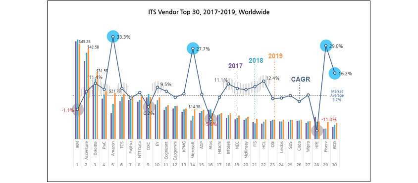 [Figure 1] shows the revenue and growth rate top 30 global IT services companies from 2017 to 2019. The market grew by an average of 5.7%, while AWS, Microsoft, and Fiserv, Inc. recorded higher growth rates of around 30%, emerging as disruptors in the global IT services market. The parent company of AWS, Amazon, is a major company in the retail industry, as Microsoft is in the software industry, and Fiserv in the business process outsourcing (BPO) sector.