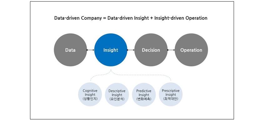 The information is based on a significant amount of data and insightful analysis rather than a few data combinations. Therefore, it is not called information but insight into the industry. So, the meaning behind the phrase a “data-driven company is run by data” is that the “data-driven company makes decisions according to the insights from processed data and takes applicable measures (data-driven insight, insight-driven operation).”
