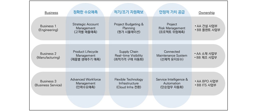 - Business 3 (Business service)/Advanced workforce management (Predict manpower demand)/Flexible technology infrastructure (Cloud infra transformation)/Service intelligence & automation (Automation of simple and repetitive works)/AA BPO division, BB ITS division