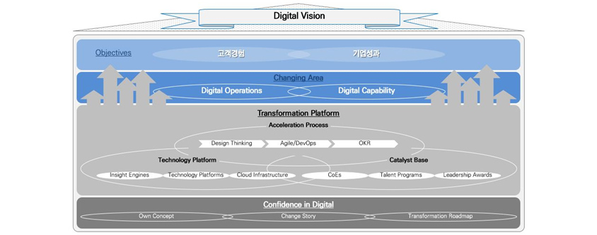 - Transformation Platform - Acceleration Process (Design Thinking, Agile/DevOps, OKR), Technology Platform (Insight Engines, Technology Platform, Cloud Infrastructure), Catalyst Base (CoEs, Talent Programs, Leadership Awards)