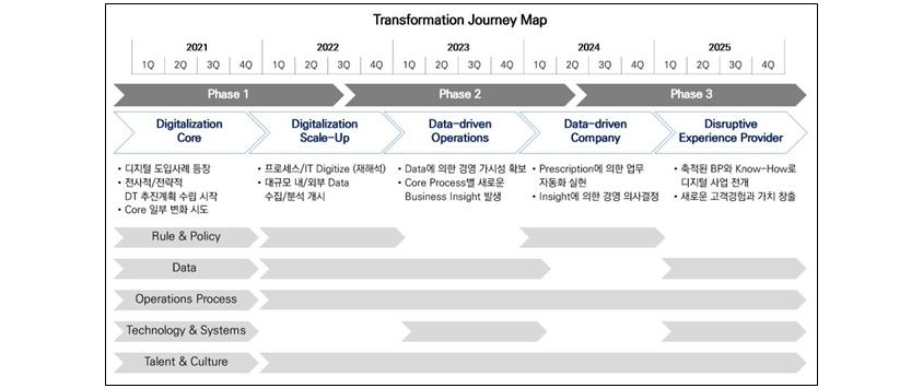 - Phase 3: Data-driven Company, Disruptive experience Provider - Promote digital business with accumulated BP and know-how, Create new customer experience and values