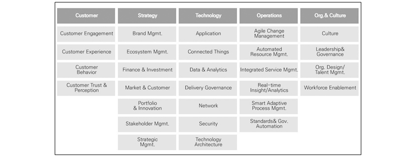 - customer understandings, strategy & leadership, technology & infrastructure, operations, people organization & culture