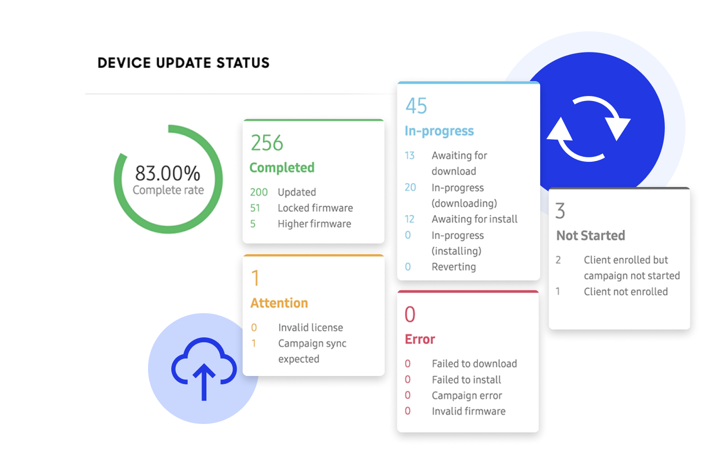 O Samsung Knox E-Fota One garante conformidade total, permitindo que você imponha atualizações de firmware obrigatórias para cada dispositivo e assegure visibilidade completa através de um painel baseado em nuvem. A integração com EMM permite importar e sincronizar informações de seus sistemas EMM para agilizar o processo de atualização.