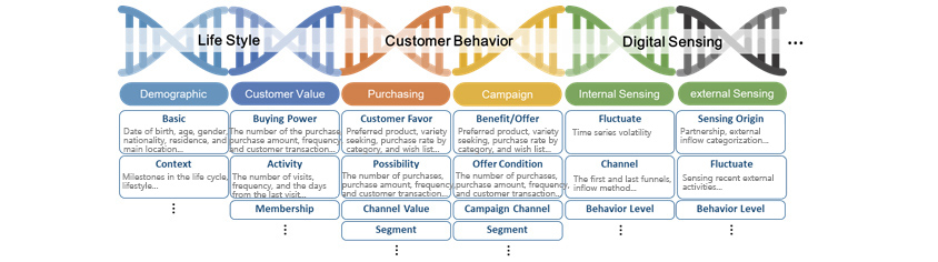 CRM data is based on past data and has dozens of items in the three contexts with longer data update cycles and smaller amounts of actual updates. However, to read preference context, we need to collect way more data types (for example, customer behavior logs, customer service history, online browsing history, external online behavior data, etc.) and bind hundreds to thousands of analyzed data points for customers.