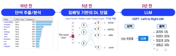 About 10 years ago, financial institutions in Korea widely adopted solutions that analyzed the frequency of meaningful text within sentences through morphological analysis of nouns, verbs, adjectives, adverbs, particles, and other elements. To perform this analysis effectively, it was necessary to manually compile and input dictionaries of synonyms, plural forms, and other terms. Another approach used was the scenario rule-based chatbot solution, which defined specific answers to specific questions. Both solutions required extensive manual work and had significant limitations in sentence recognition and analysis. After a period of stagnation, financial institutions began to take an interest in the latter half of 2019 when Google published a paper on BERT* a transformer-based deep learning language model. Through vectorization technology, which converts text into numbers (embedding), models were trained using structured data as input. However, to achieve proper training, a large amount of data and costly infrastructure resources were required, and these efforts were limited to pilot projects due to a lack of BP (Best Practice) cases.
