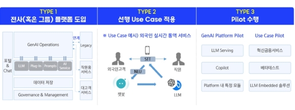 The first approach is adopting a platform that can be used across the entire organization or group. Large financial institutions with strong vision and confidence in generative AI technology are either adopting a platform or building their own platforms. They gradually expand use cases and AI application areas by internalizing the technology. Although the initial costs may be high, this approach can reduce redundant investments for similar use case implementations in the long term.