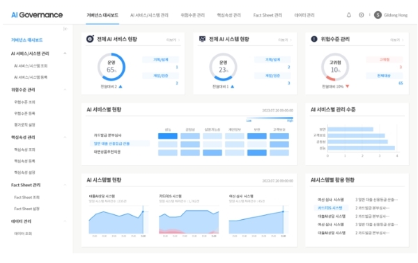 Furthermore, the AI governance framework includes AI governance implementation, which involves defining metrics at each stage of AI service planning, development, verification, and operations to assess risk levels and monitor compliance. To manage this overall governance framework, it is essential to have AI governance technology (systems), such as AI platforms, system toolkits, and AI dashboards. Through the AI governance system, financial institutions can monitor the overall status of AI systems/services in operation and the risk levels of each system/service. For instance, for an AI service like 'general loan credit rating calculation,' the system can manage indicators, such as performance, whether it remains under human control, respects customer rights, protects personal/sensitive information, and is explainable.