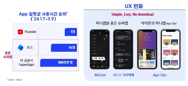 A SuperApp provides various lifestyle services within a single, integrated platform, offering a seamless user interface. This approach is designed to capture customers' attention by providing convenient access to high-quality content and diverse services, ultimately contributing to strong customer retention, known as "lock-in." [2] According to "Data.ai," a site that analyzes app usage statistics, from January to March 2024, the app with the highest average daily usage was YouTube. In the financial SuperApp category, Toss ranked 56th overall (and first among financial SuperApps). Other financial SuperApps ranked outside the Top 100. Unlike other financial platforms, Toss lacks an offline alternative channel and focuses on providing various short-term events and payment services. Toss has created a highly convenient user-friendly interface by emphasizing the user experience through the operation of agile teams specialized in channel development. This approach, offering financial services that are simple and easy to use, has garnered significant support and empathy from the MZ generation (Millennials and Generation Z).