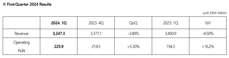 Samsung SDS unveiled its preliminary financial results for the first quarter of 2024, posting a revenue of KRW 3.2473 trillion and an operating profit of KRW 225.9 billion. Compared to the same period last year, its revenue fell by 4.5% but operating profit rose by 16.2%.