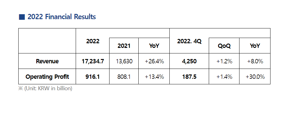 + 2022 4Q financial results recorded KRW 4.25 trillion in revenue and KRW 187.5 billion in operating profit