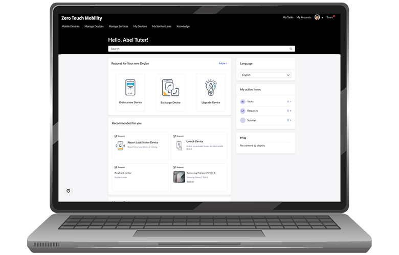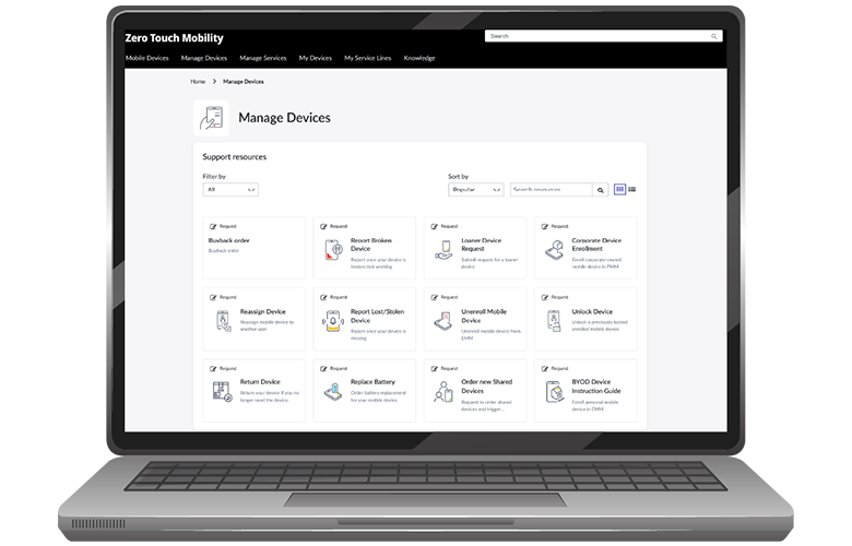 ZTM provides a simple and intuitive portal where employees can request a device based on their role or need. Once configured, ZTM can fulfill requests by deploying devices from the company’s inventory or procuring new devices directly from carriers like AT&T and Verizon if inventory is unavailable.