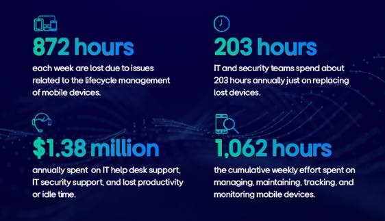 In addition to lifecycle challenges, 203 hours are spent annually solely on replacing lost devices, adding further strain on IT and security resources. Meanwhile, the cumulative effort required each week to manage, maintain, track, and monitor mobile devices reaches 1,062 hours, diverting valuable time from critical business functions.